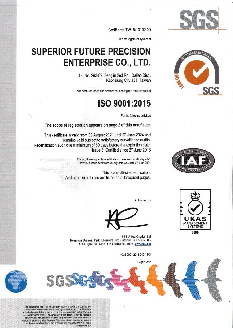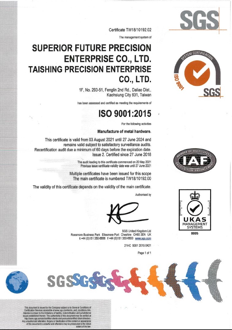 連毅/泰興精密企業已通過 SGS認證取得最新 ISO 9001:2015 品質管理工廠認證